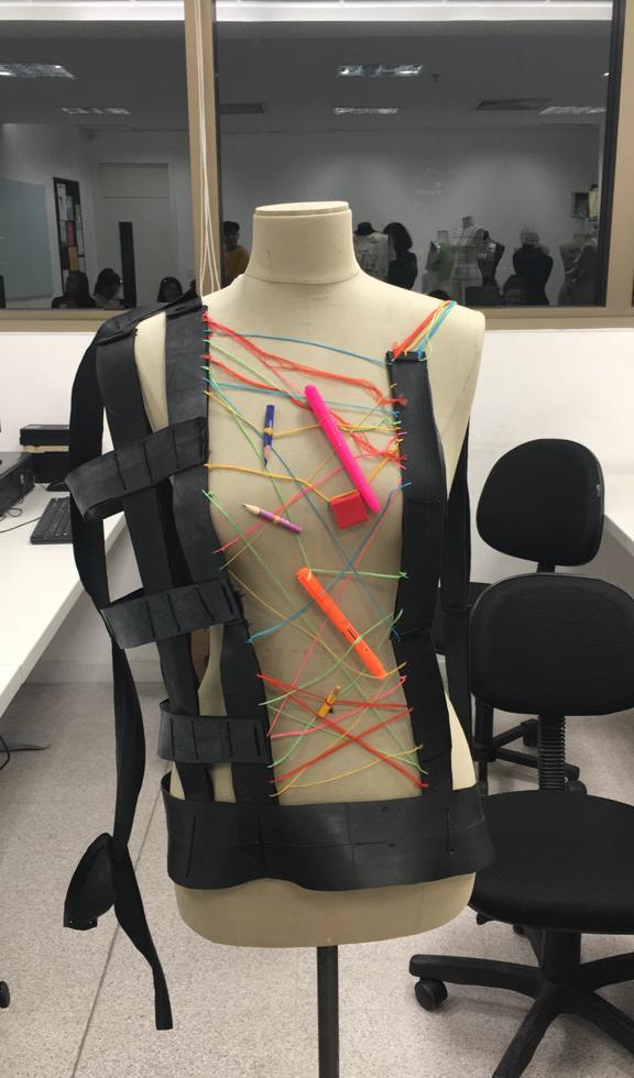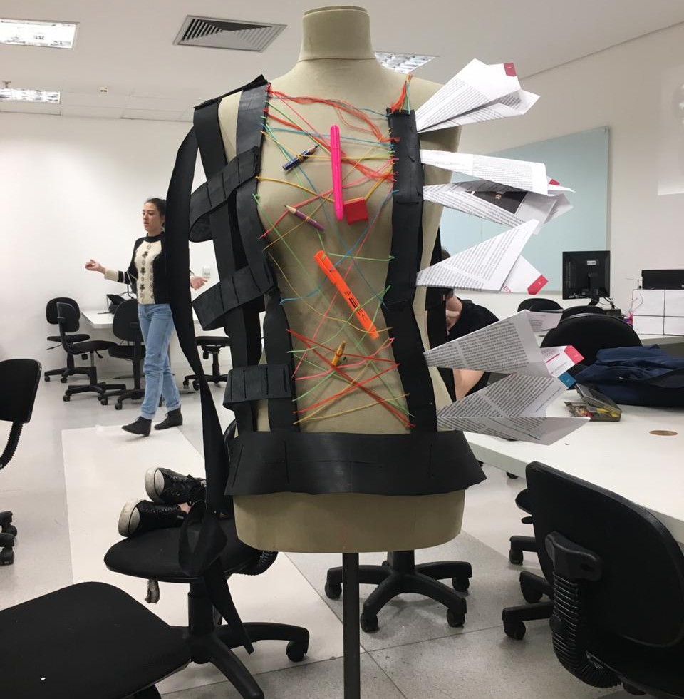 A proposta do Projeto Interdisciplinar do primeiro semestre é construir um Objeto Tridimensional Vestível (OTV) utilizando apenas materiais de descarte. Esse objeto deveria ser pautado em alguma discussão que envolvesse sustentabilidade. Pensando nisso, nosso grupo fez uma análise dos materiais que mais descartávamos e devido ao fato de sermos ex-estudantes de ensino médio e o outro membro do grupo ser uma pedagoga notamos o acumulo de materiais escolares não mais utilizados. Dessa forma, o tema escolhido para o nosso OTV foi "O desperdício de materiais escolares".