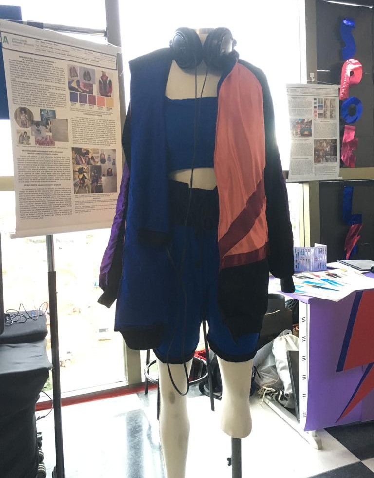 A maior referência visual para a criação foram as cores e aspectos estilísticos da década de 80. Já em relação aos materiais, a prioridade era o conforto e a mobilidade e todos os tecidos utilizados no look foram retirados de um banco de tecidos (cetim e malha de algodão). Essa, inclusive, foi uma das maiores dificuldades do grupo (achar as combinações perfeitas dentro das limitações do banco), junto com a costura e a modelagem (essa matéria não faz parte da grade curricular do semestre). É válido ressaltar que as sobras não danificadas desses tecidos foram reutilizadas em outros trabalhos dentro da própria universidade.